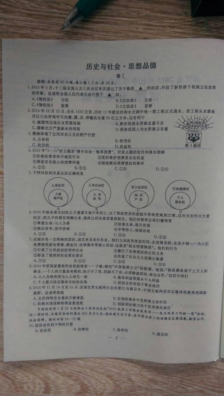 2015年浙江省丽水市中考历史政治试题(扫描版)