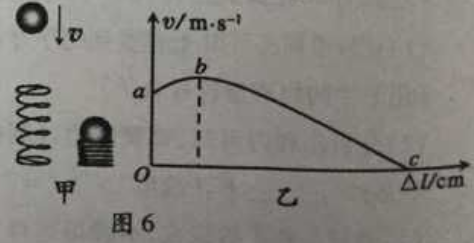 16.如图6甲所示,小球从某高度处静止下落到竖直放置的轻弹簧上并压缩弹簧。从小球刚接触到弹簧到将弹簧压缩最短的过程中,得到小球的速度v和弹簧被压缩的长度△l之间的关系,如图6乙所示,其中b为曲线最高点。不计空气阻力,弹簧在整个过程中始终发生弹性形变,则小球