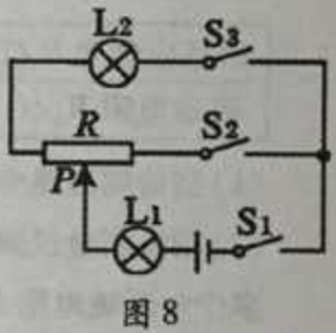 20.如图8所示,电源电压12V,滑动变阻器标有“10Ω1 A”字样,灯Ll、L2分别标有“6 V 6W”和“3V 3W”字样。只闭合Sl、S3时,滑动变阻器滑片P位于某位置,灯L1、L2均正常发光,则通过灯L1的电流为____A,滑动变阻器消耗的电功率为Pl;此时只闭合Sl、S2,为保证灯L1正常发光,滑片P应向____移动(选填“左”或“右”),滑动变阻器消耗的电功率为P2,则Pl:P2=____。