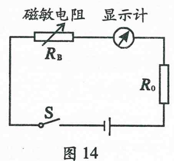 24.(9分)磁场的强弱可用磁感应强度(B表示,单位为特斯拉(T)。小华设计了磁感应强度测量仪,图14为其原理图。该仪器显示计由电流表改装,电源电压6V,定值电阻R。为40Ω,