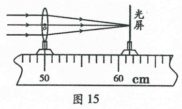 (1)他将凸透镜正对着太阳,使之在光屏上形成最小、最亮的光斑,如图15所示,则该透镜的焦距为____ cm。