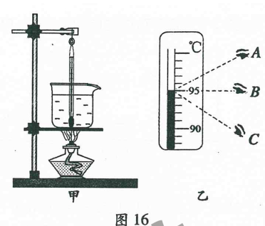(2)他纠正错误后继续实验,某时刻温度计的示数如图16乙所示,其中读数方法正确的是____(选填““A”、“B”或“C”),示数是____ ℃。