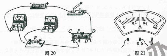 ③闭合开关,滑动变阻器的滑片P移动到某一位置,电压表的示数为1.5V,电流表的示数如图21所示,其示数为____A,则R的阻值是 Ω。实验中需要多次测量求平均值的目的是________。
