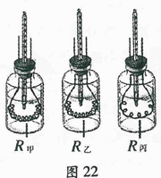 (2)他想设计一个电路探究电流产生的热量与电流和电阻的关系。提供的器材是:图22所示的三个插有温度计的相同玻璃瓶(瓶内装有质量、温度相同的煤油,三根电阻丝的电阻大小关系为:R甲=R乙>R丙),还有一个滑动变阻器,一个单刀单掷开关,一个单刀双掷开关(符号