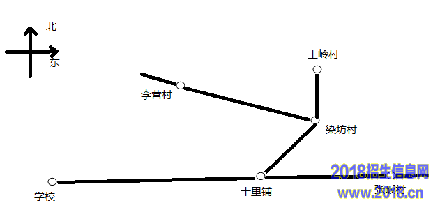 (3)班级采风小组到王岭村搜集歇后语。请你根据下面的示意图写一段话,告诉同学们怎样从学校前往目的地。(50字以内)