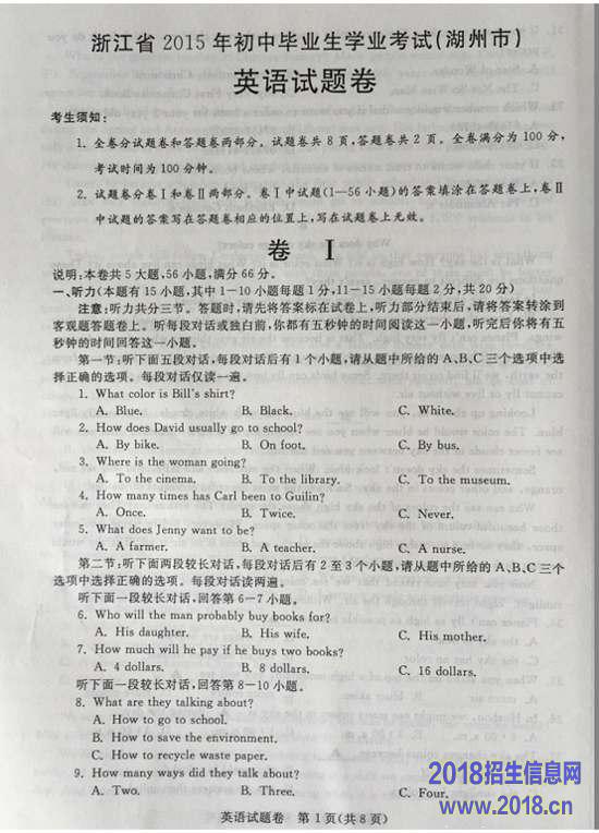 2015浙江湖州中考英语试题及答案(图片版,含答案)