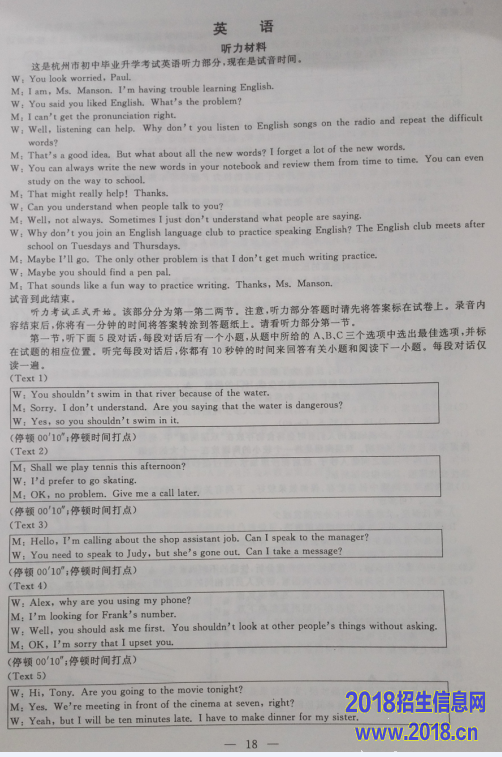 2015年浙江省杭州市中考英语试题(扫描版,含答案)