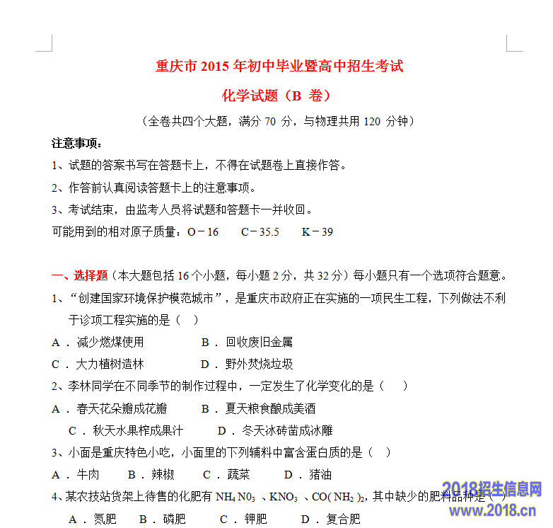 2015年重庆市中考化学试题B卷及答案(图片版,含答案)
