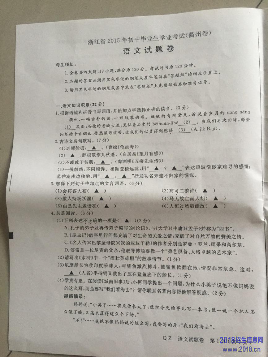 2015浙江衢州语文中考试卷及答案(扫描版)