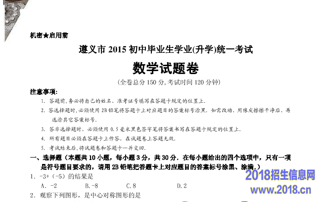 2015年贵州省遵义市中考数学(扫描版,含答案)