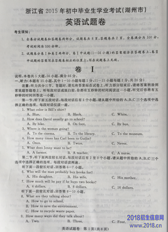 2015年浙江省湖州市中考英语试题(扫描版,含答案)