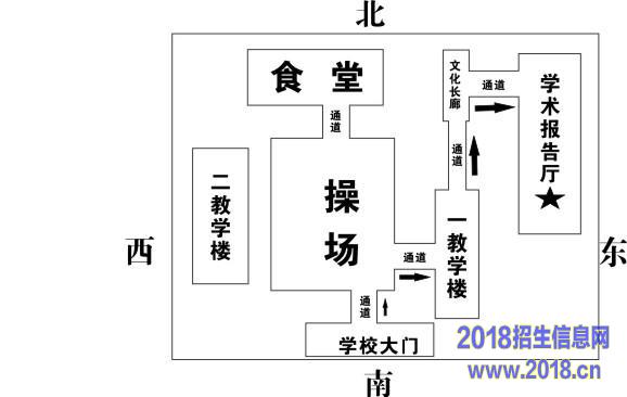 学校拟开展“我与广告零接触”活动,决定请某广告商到学校学术报告厅作广告知识讲座。请根据下面的平面示意图,向前来进行讲座的同志介绍从学校大门到学术报告厅的行进路线。(1分)