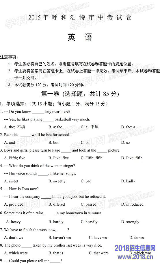 2015内蒙古呼和浩特市中考英语试题(图片版,含答案)