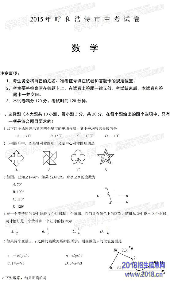 2015内蒙古呼和浩特市中考数学试题(图片版,含答案)