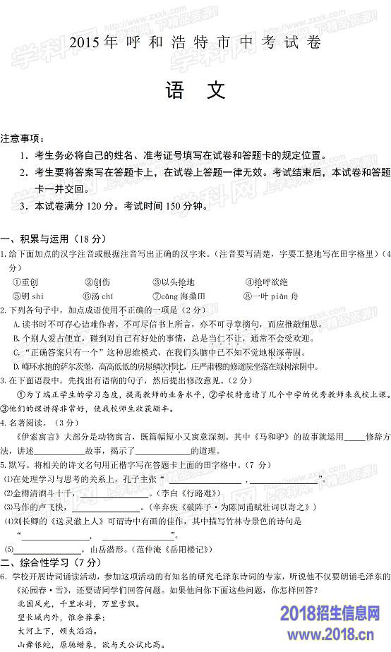 2015内蒙古呼和浩特市中考语文试题(图片版,含答案)