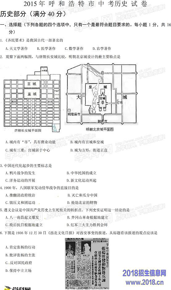 2015内蒙古呼和浩特市中考历史试题(图片版,含答案)