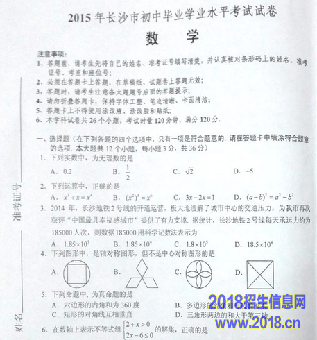 2015年湖南省长沙市中考数学试题(扫描版,无答案)