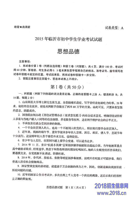2015年山东省临沂市中考政治试题(扫描版,无答案)