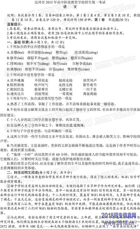 2015年四川省达州中考语文试题及答案(图片版)