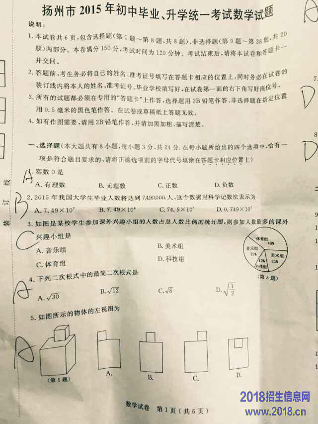2015年江苏省扬州市中考数学试题(扫描版,无答案)