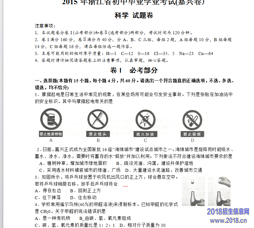 2015浙江嘉兴中考科学试卷(图片版,含答案)