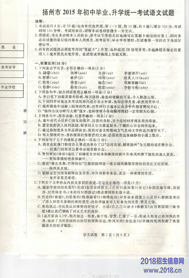 2015年江苏扬州市中考语文试题(图片版)
