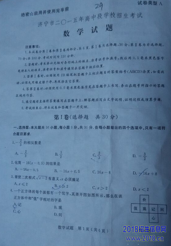 2015年山东省济宁市中考数学试题(扫描版,含答案)