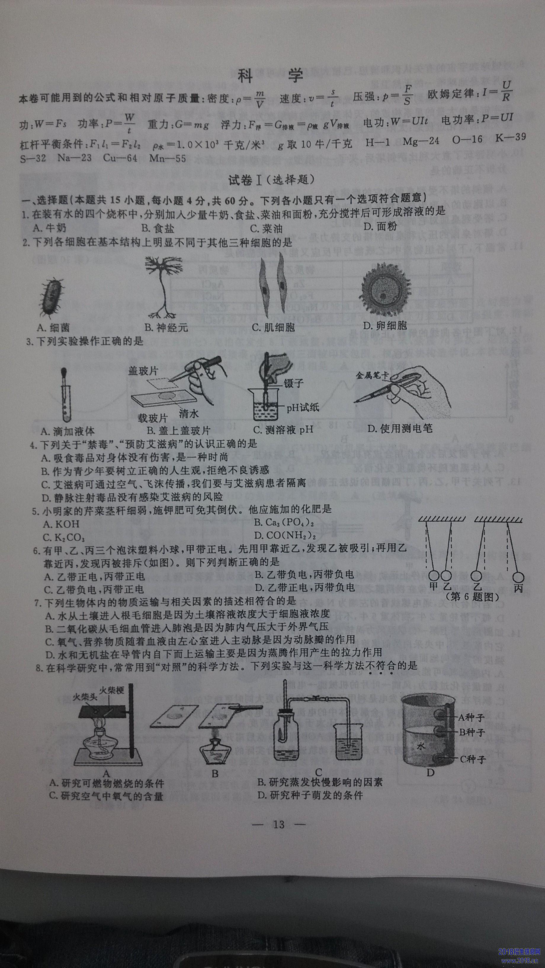 2015浙江绍兴中考科学试卷(图片版,含答案)