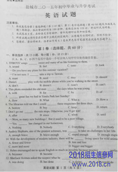 2015年江苏省盐城市中考英语试卷(图片版,无答案)