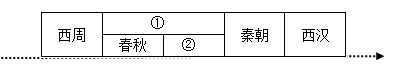(1)材料一示意图中的①②处应该填写的朝代(时期)分别是什么?结合所学知识,西周的建立者是谁?据材料二,归纳西周实行政治制度的作用。(5分)