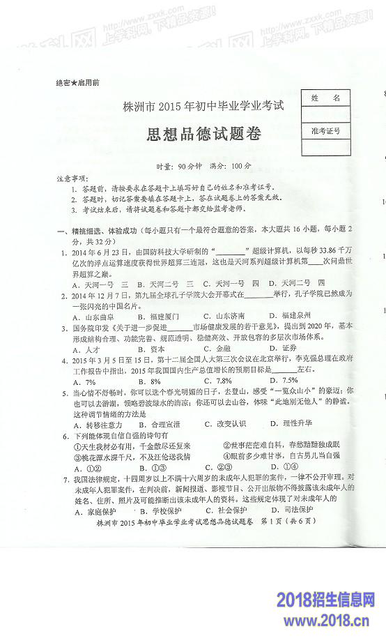2015年湖南省株洲市中考政治试题(扫描版, 无答案)