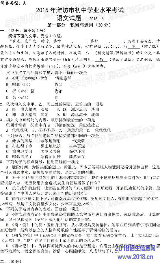 2015年山东省潍坊市中考语文试题(扫描版,含答案)