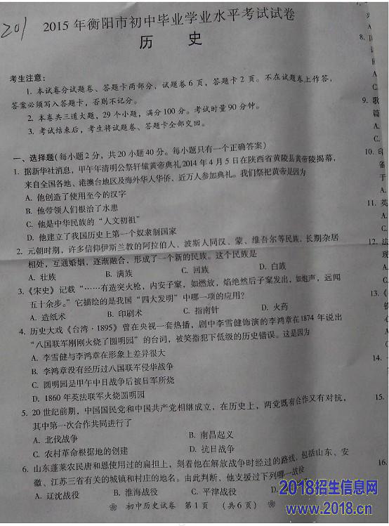 2015年湖南省衡阳市中考历史试题(扫描版,无答案)
