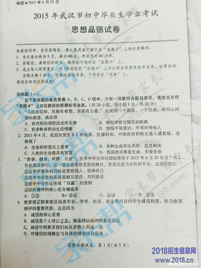 2015年湖北武汉中考思想品德(政治)试题(图片版)