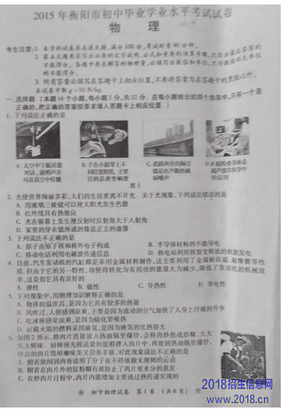 2015年湖南衡阳中考物理试题(图片版,无答案)