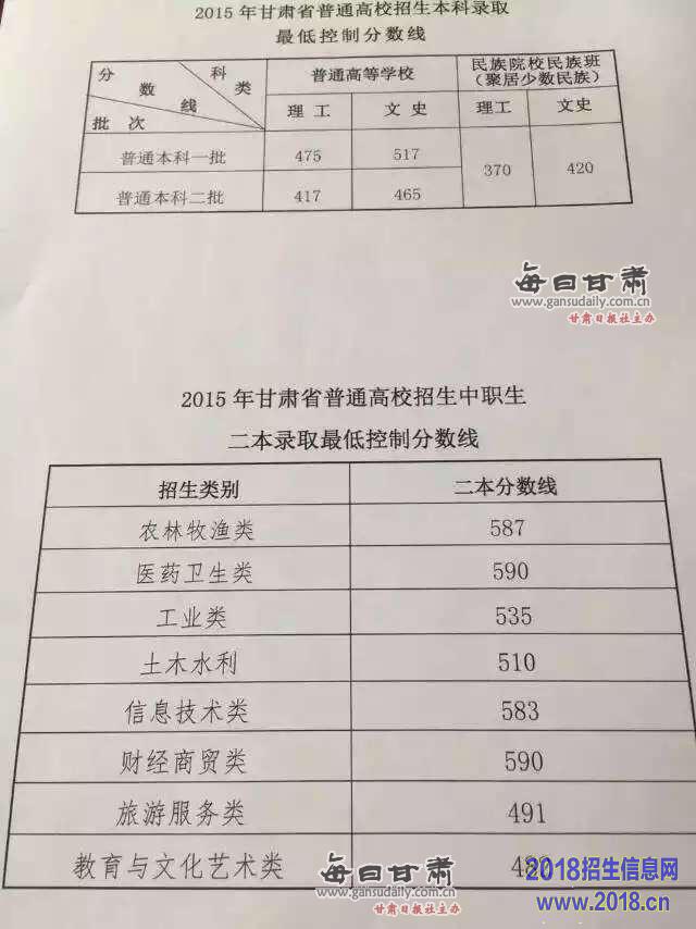 2015年甘肃省普通高校招生“中职生”二本录取最低控制分数线为:农林牧渔类587分,医药卫生类590分,工业类535分、土木水利类510分、旅游服务类491分。信息技术类583分、教育与文化艺术类482分、财政商贸类590分。今年高考分5批填报志愿。