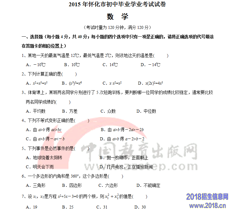 2015年湖南省怀化市中考数学试卷(图片版,无答案)