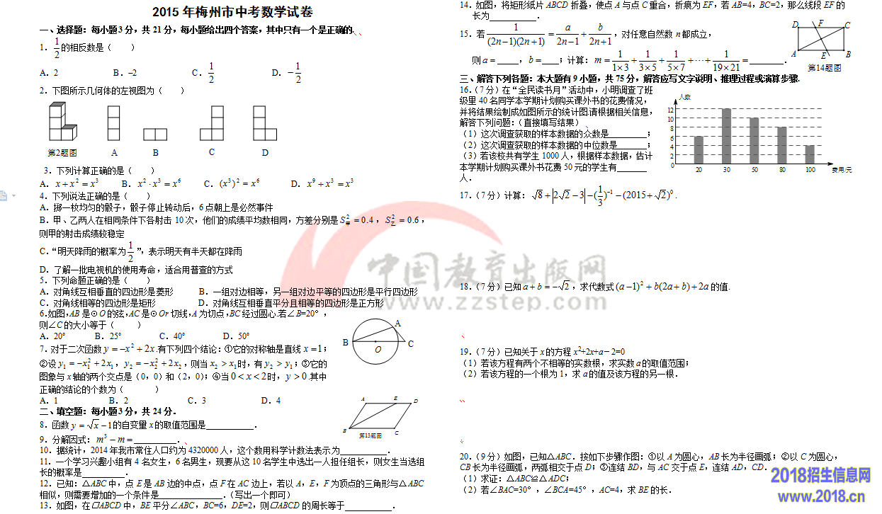 2015年广东省梅州市中考数学试卷(图片版,无答案)
