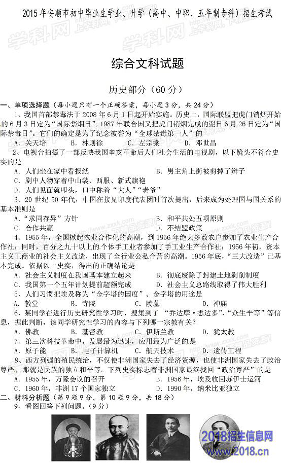2015年贵州省安顺市中考历史试题及答案