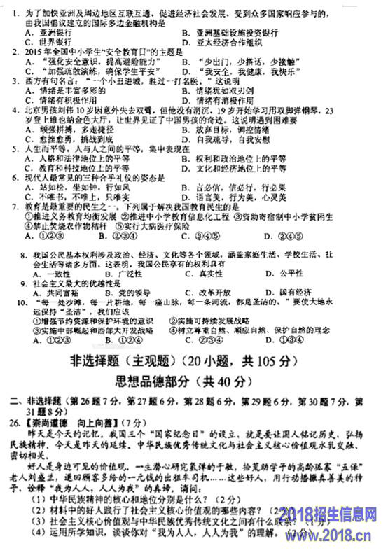 2016年南京中考政治试题及答案
