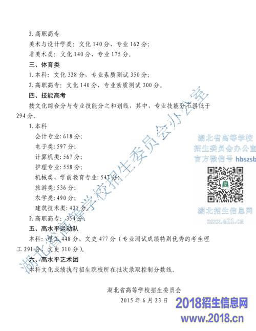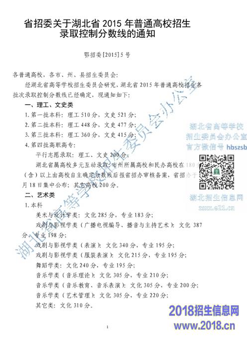 2015湖北高考分数线发布。一本:理工510分,文史 521分;二本:理工448分,文史477分;三本:理工360分,文史415分;高职高专:理工、文史200;体育类:328。
