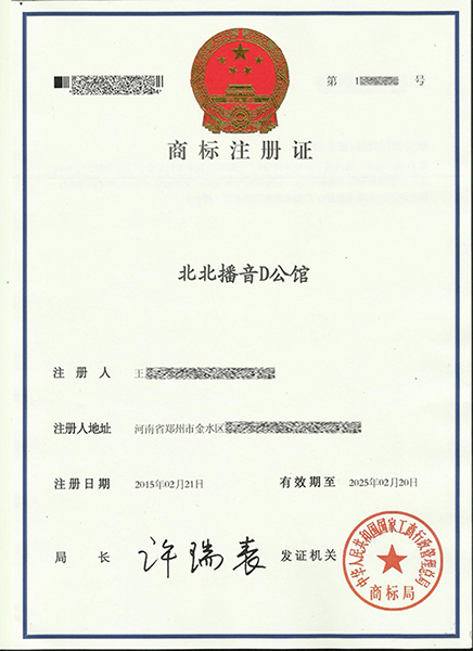 2015年2月21日,北北播音D公馆获得由国家商标总局签发的商标证书,由此,北北播音D公馆获得国家品牌商标法律保护,在此,郑重提醒广大学员,一定要认准品牌,切勿上当受骗。