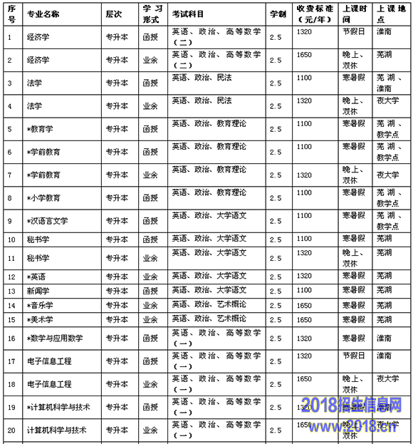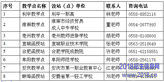 为方便学员学习,我校已在亳州、利辛、淮南、合肥、宣城、阜阳、安庆、蚌埠等地建立了函授站(点),现委托以下函授站点在当地开展2015年招生宣传和生源组织工作,如录取考生达到一定人数,我校将在当地开班上课。(详见下表)。