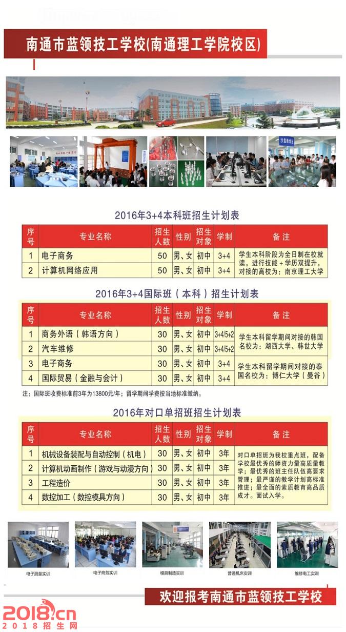 南通市蓝领技工学校2016年招生专业及计划表