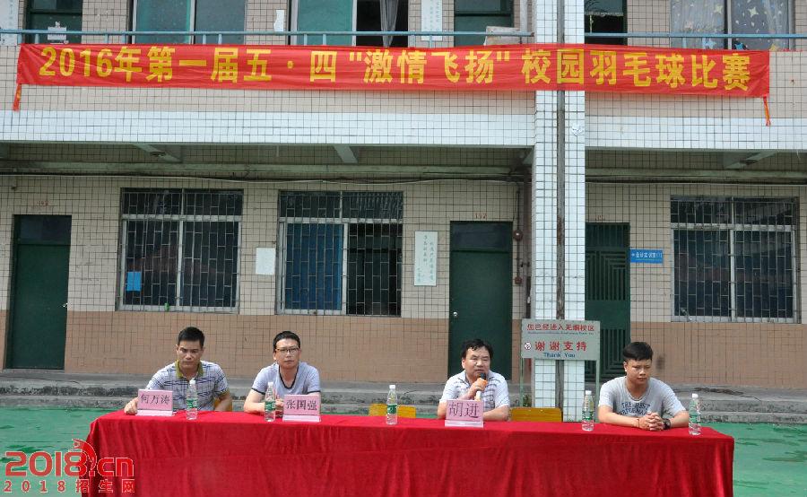 为了丰富我校学生的课余娱乐生活,满足学生对展现、挑战、超越自我的需求,彰显我校学生积极向上的精神风貌,2016年05月04日,我校第一届五四“激情飞扬”校园羽毛球比赛在羽毛球场正式拉开帷幕。校长胡进、校办公室主任张国强、学生科科长何万涛、团委书记蔡怀建等领导与百余名同学共同参加并观看了本次比赛活动。