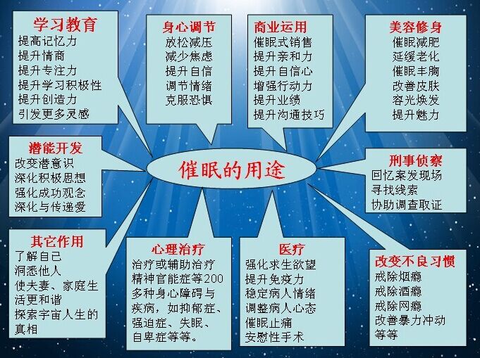 学习催眠的理由:心理健康已经成为成功快乐的另一个代名词,心灵能量的提升更是被证明是一个人能力的核心。而催眠正是打开这道门的钥匙。学习催眠不但要学习深层的观察能力,还要学习精确运用语言的技巧,这恰好是21世纪高竞争的环境所急需的能力。催眠应用面广、见效快,直接在潜意识层次达到久远的效果——催眠处理生理和心理健康方面无须昂贵设备、无须药物、无副作用,同时效果显著。杰出催眠治疗师是许多人生命中的贵人。我们身边有太多人需要我们的帮助,而我们却是有心无力。催眠治疗是助人助己,威力强大的工具。催眠有开发潜能、改变习惯、提升智慧与心灵等众多用途