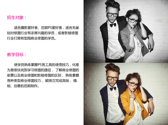 授课对象:适合摄影爱好者、后期PS爱好者,适合无基础对修图行业有浓厚兴趣的学员,或者影楼修图行业打算转型围商业修图的学员。