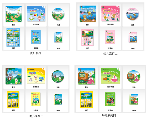 幼儿教材每册包含:书、生词本、活动手册、挂图,同时配送光碟一张、磁带一盒及书包一个。