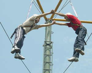 空中单杠 | 本项目为高空项目,要求学员在八米高的空中,向空中跃出,能碰到前面距离自己80CM左右的单杠为项目成功。 | 此项目于高空断桥有同样的作用,考验参训人员的个人挑战极限能力。但同时在团队中,也考验团队压力与领导如何利用群体策略进行团队鼓励,从而让有困难的队员突破自身极限。 |