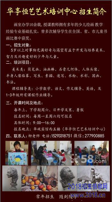 华亭恒艺艺术培训中心常年招生主要培训项目有:美术类:国画、素描、速写、水粉、水彩、简笔画、油画棒。小学课程(作业)辅导类:语文、数学、英语、作文